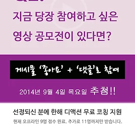 디액션 영상놀이 시즌1 - 영상 공모전 START 2014.09.05, 금요일 드디어 영상놀이 서비스가 시작되었습니다. 디액션 영상 코칭 명단[호서직업전문학교] 김정환,김강용,이우석,최광섭,김도희,정예훈,윤경필,남기훈 (대1)[서울산업정보학교] 차유정,최우석,최동철,정소희,전효진 (고3) [대신고등학교] 이승환, 임우준 (고2) 이번 디액션 영상놀이 시즌1 의 주제는 영상 공모전 뽀개기입니다.참가자들은 영상공모전에 처음 도전해보는 학생들, 경험이 있는 학생들 총15명의 학생들로 다양하게 구성되었는데요. 디액션 최정욱 대표님의 영상놀이 서비스 오리엔테이션 진행 모습 2014.09.05 - 오리엔테이션 모습입니다.가장 먼저 최정욱 대표님께서 영상놀이 서비스의 소개와 영상 기획에 대한 강연을 해주셨습니다.이어..
