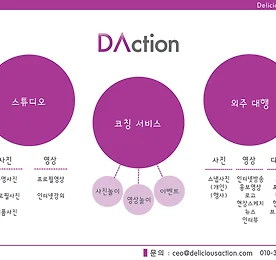 디액션 사업영역 리뉴얼 디액션(DACTION) 사업영역 리뉴얼 ① 스튜디오 : 본인PR정도에 따라 저렴한 가격에 서비스를 누릴 수 있다. 사진 - 증명사진, 프로필사진,제품사진 영상 - 프로필영상, 인터넷강의 ② 코칭 서비스 : 본인이 만들고 싶은 콘텐츠를 코칭을 통해 직접 참여함으로서 제작/개최가 저렴한 가격에 완성이 가능하다. 사진놀이,영상놀이,이벤트개최 ③ 외주 대행 사진 - 스냅사진 영상 - 인터넷방송,홍보영상,로고,현장스케치,뉴스,인터뷰 등 디자인 - 로고, 포스터, 판넬, 현수막, 브로슈어 등 문의 : ceo@deliciousaction.com 010 3708 9282 더보기