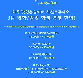 3월 입학/졸업 학생 특별 할인 이벤트 맛있는놀이터 사진스튜디오 3月 입학/졸업 ‘학생’ 특별 할인! ※ 사전예약제, 입학/졸업생이라는 것을 증명할 수 있는 서류 아무거나 꼭 지참해올 것! #1.증명사진(8장)/여권사진(4장) 16,000원 -> 11,000원 #2.취업사진(8장) 30,000원 -> 25,000원 #3.프로필사진(3컷) 60,000원 -> 50,000원 ■ Package #1(증명사진) + #1(여권사진) + #3(프로필사진) = 92,000원 -> 70,000원 ■ Package #1(여권사진) + #2.(취업사진) + #3(프로필사진) = 106,000원 -> 85,000원 강서구 No.1 유일한 문화예술복합라운지, 맛있는놀이터(디액션) 사진/영상 스튜디오ㅣ강연/세미나ㅣ파티/이벤트ㅣ기타공간대여 + 디액션스쿨 (문의) 07.. 더보기